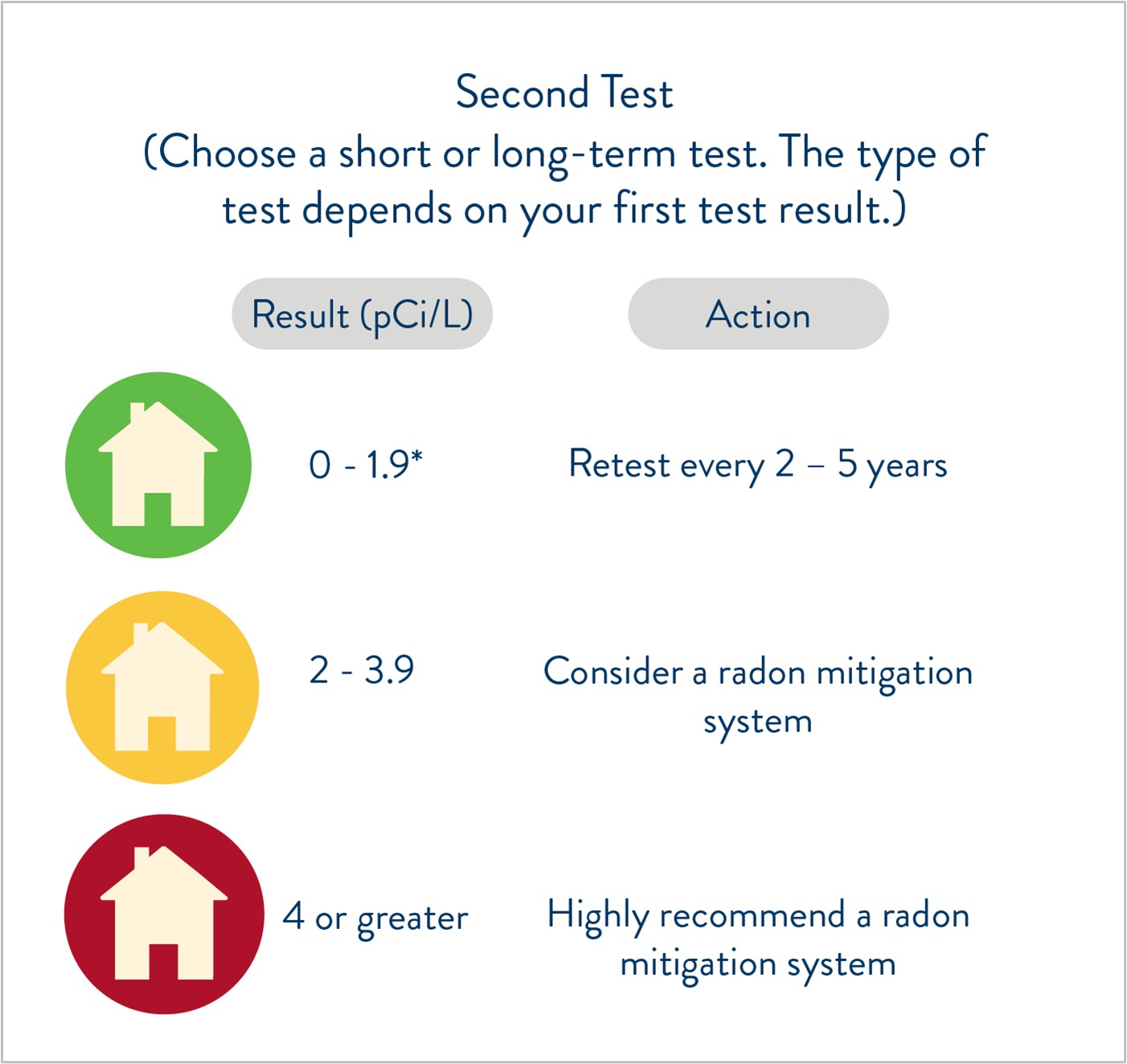 When testing for radon start with a short-term test. The results from your first test will determine what your next steps will be. If the result is 0 to 1.9 pCi/L, retest every 2 to 5 years. If the test result is 2 to 7.9 pCi/L, perform a long-term follow-up test. If the test is 8 pCi/L or greater, perform a short-term follow-up test. (Click on image below to enlarge)