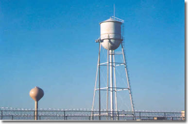 The existing water treatment system goes back to the opening of the prison. Two wells (one outside the fence and the other next to the treatment plant, which is directly underneath the existing 150,000 gallon tower) feed the plant, which has one pressure filter. The primary function of the plant had been iron reduction, and the chemical addition included potassium permanganate, caustic soda, zinc orthophosphate, and chlorine.