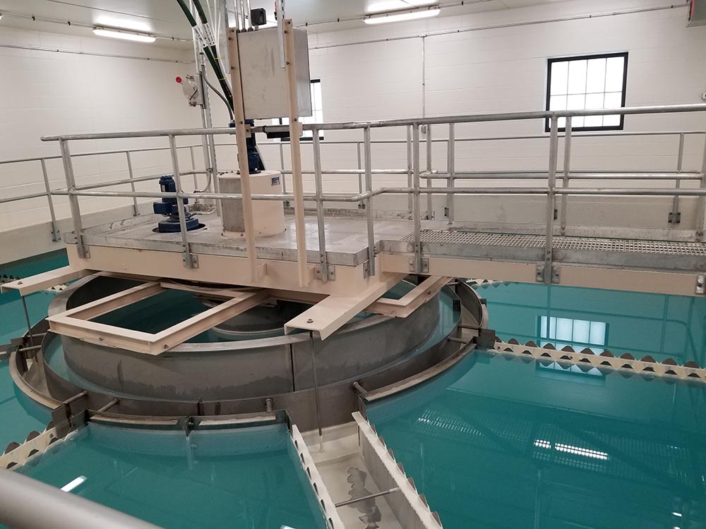 In the photo on the left, Chad Kolstad (far left) presents the EPA Aquarius Award to Pipestone mayor Myron Koets. The photo on the right shows the clarifier at the Pipestone plant.