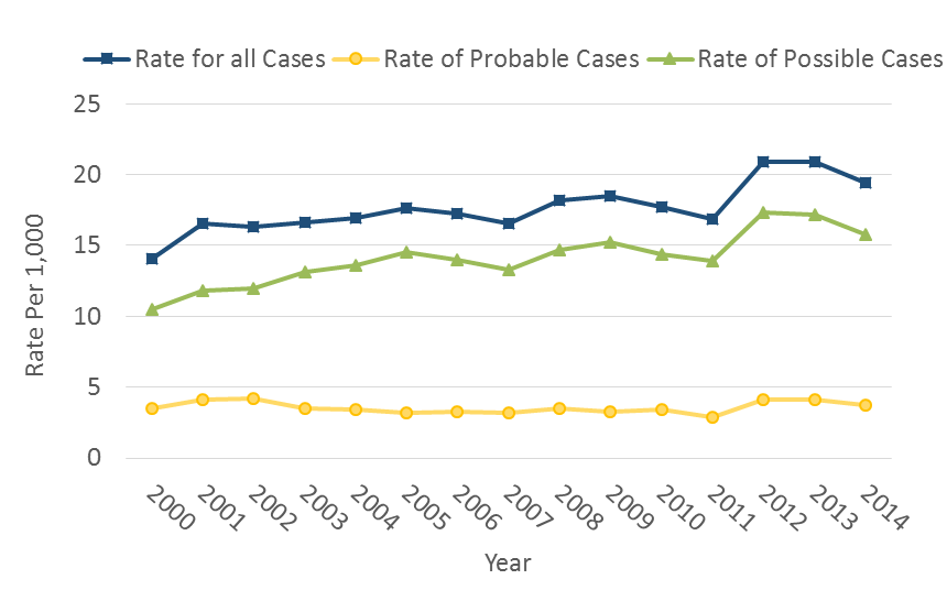 The numbers, rates, and trends of agricultural injuries in Minnesota from 2000 to 2014 are shown in the graph and table below. From 2000 to 2014 the data shows a statistically significant increasing trend for the total number of cases per year, with the driving force for this increase among injury cases identified as occurring with animals.