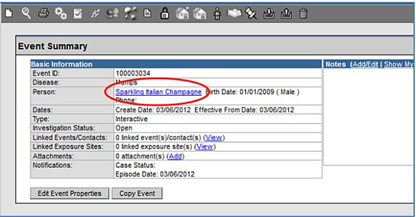 The “Event Information” displays all Events you have access to see for the given person, as well as Linked Events/Contacts and Linked People if you use those functions. The hyperlinks you see are the Events and/or People associated with the current person. Pressing one of the hyperlinks will exit you from the current “Person Summary” to the selected “Event Summary” or the selected “Person Summary." In the example below pressing the hyperlink "Cracker, Apple Pie" will take you to the “Person Summary” for Apple Pie Cracker. Pressing the hyperlink "100003073" will take you to the “Event Summary” for the TB-Active Event of Animal Cracker.