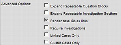 A new Reports feature can be used for any Ad-hoc ‘line list’ report. A Reports Administrator can turn the feature on if the CaseID field is selected from the “Case Fields”. The Administrator would then select [Render case IDs as links] in the “Advanced Options.”