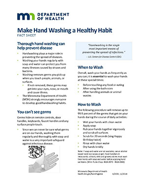 Six steps to cleaner hands poster that could be hung in restrooms. This poster was adapted with permission from the Washington State Department of Health and is available for download in fourteen languages (English, Somali, Arabic, Bengali, Cambodian, Chinese, Hindi, Korean, Nepalese, Russian, Spanish, Turkish, Ukrainian, and Vietnamese).